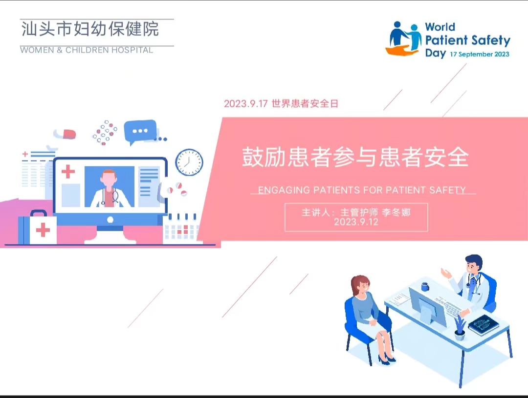在第五个世界患者安全日来临之际,我院组织开展了与患者、家属共同探讨患者安全的主题活动。旨在:1、提高患者及其家属和照护人员在医疗机构中积极参与诊疗照护的必要性认识,以改善患者安全。2、促使医疗保健机构领导人、医务工作者和患者等,让患者和家属参与到安全的卫生保健的政策和实践中来。3、赋予病人和家属权利,让他们积极参与自己的医疗照护,提高患者安全性。